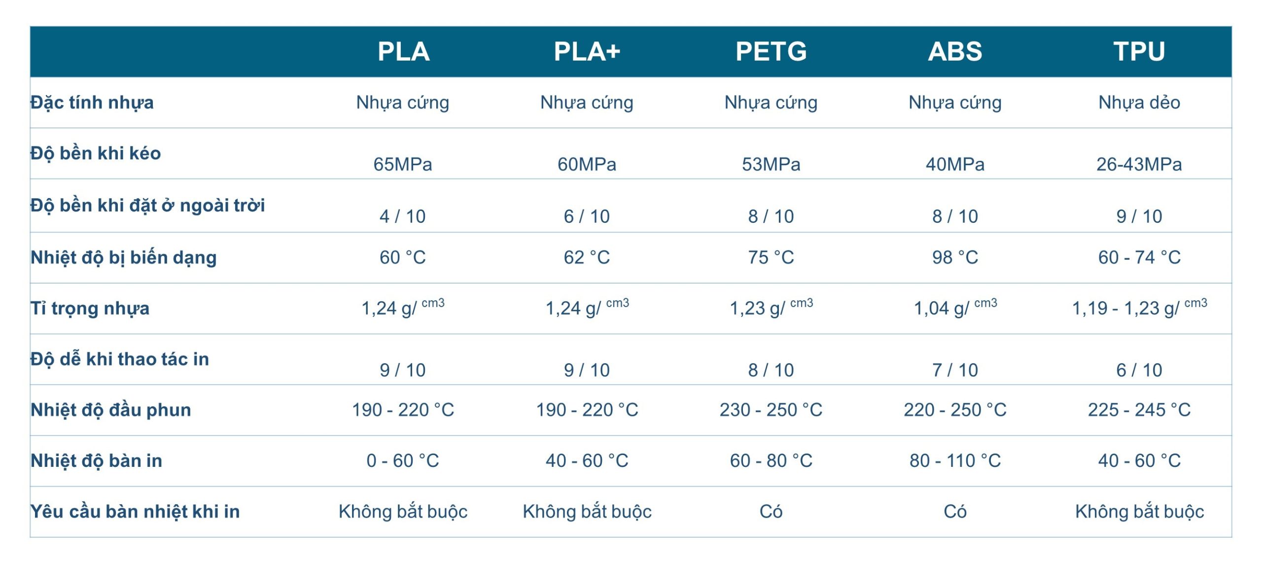 Máy in 3D FDM có thể in các loại nhựa dạng sợi tròn như: PLA, PLA+, PLA Carbon, PETG, ABS, TPU, ASA, PVA…v.v. Dưới đây là bảng đặc tính kỹ thuật của các loại nhựa  được sử dụng phổ biến tại Việt Nam
